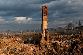 Пожар в Называевске. Печная труба на месте сгоревшего жилого дома.