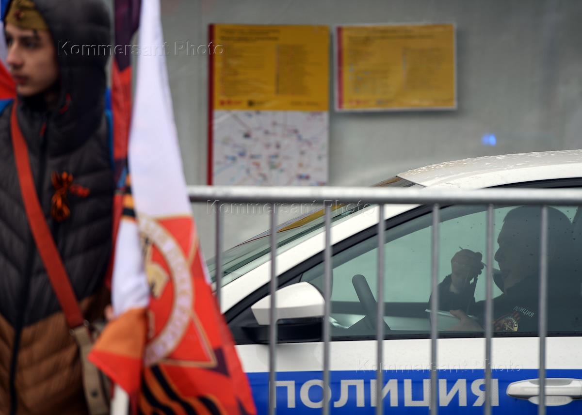 Празднование 77-ой годовщины Победы в Великой Отечественной войне. Сотрудник полиции в автомобиле во…