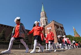 Церемония торжественного приема в пионеры на Красной площади. Школьники во время церемонии.