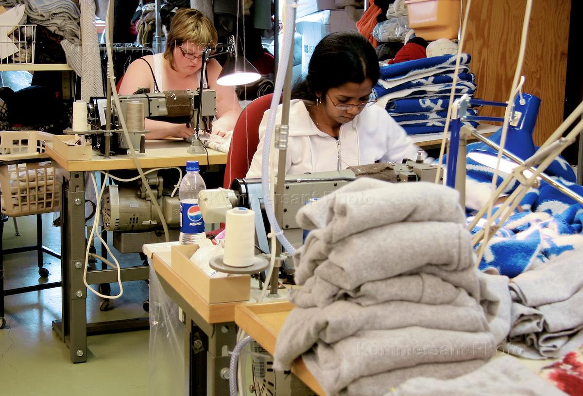 Виды Исландии. Жанровая фотография. Сотрудницы во время работы в цеху маленькой швейной фабрики в…