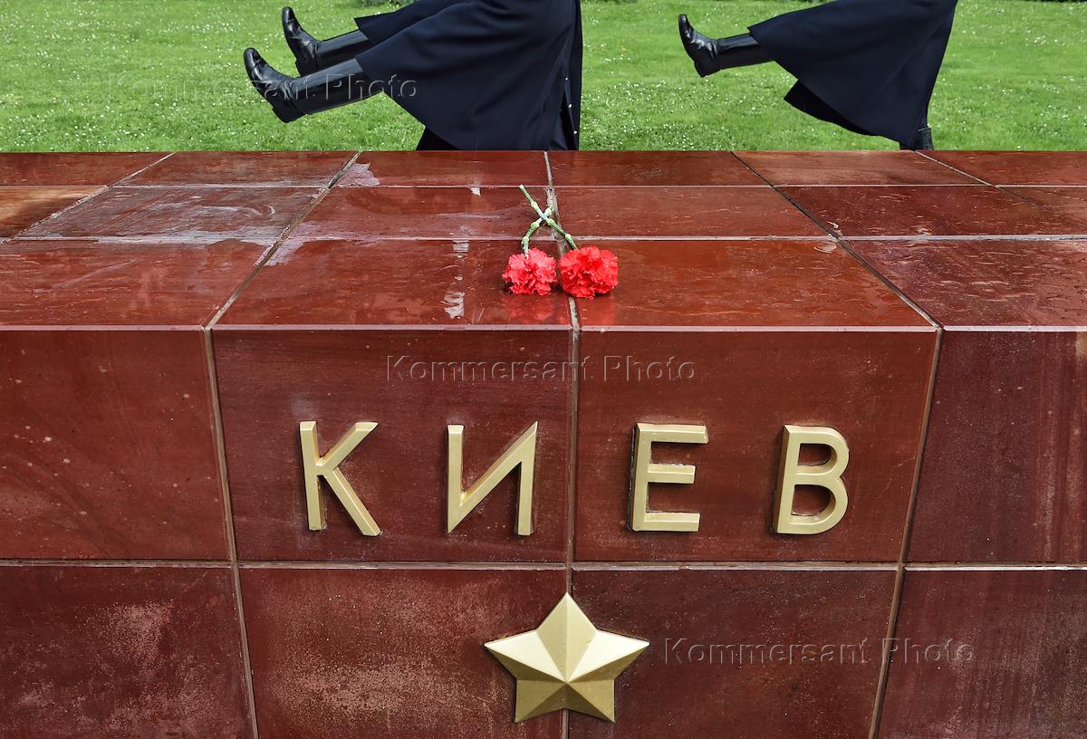 Жанровая фотография. Стелла города-героя "Киев" в Александровском саду. Две гвоздики на стелле.