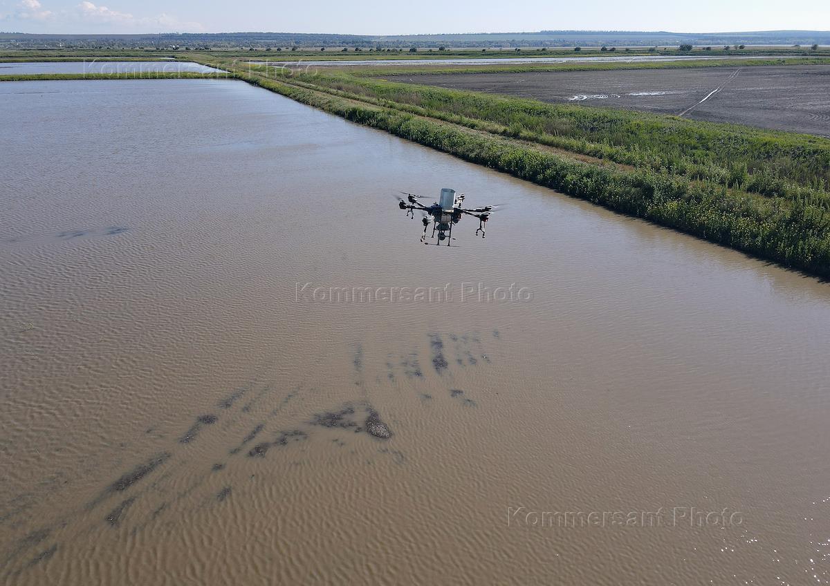 Сев риса при помощи управляемых роботов-дронов в Темрюкском районе. Жанровая фотография. Дрон летит…