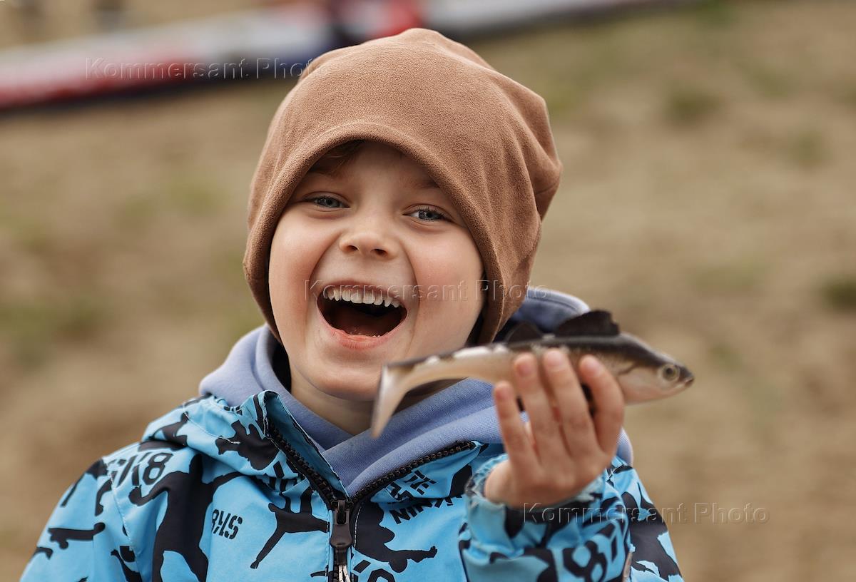 Фестиваль "Рыбная неделя" в Москве. Жанровая фотография. Мальчик держит в руках рыбку во время…