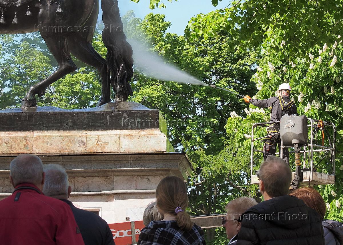 Художники-реставраторы Государственного музея городской скульптуры провели работы по промывке памятника Петру I на Кленовой улице.