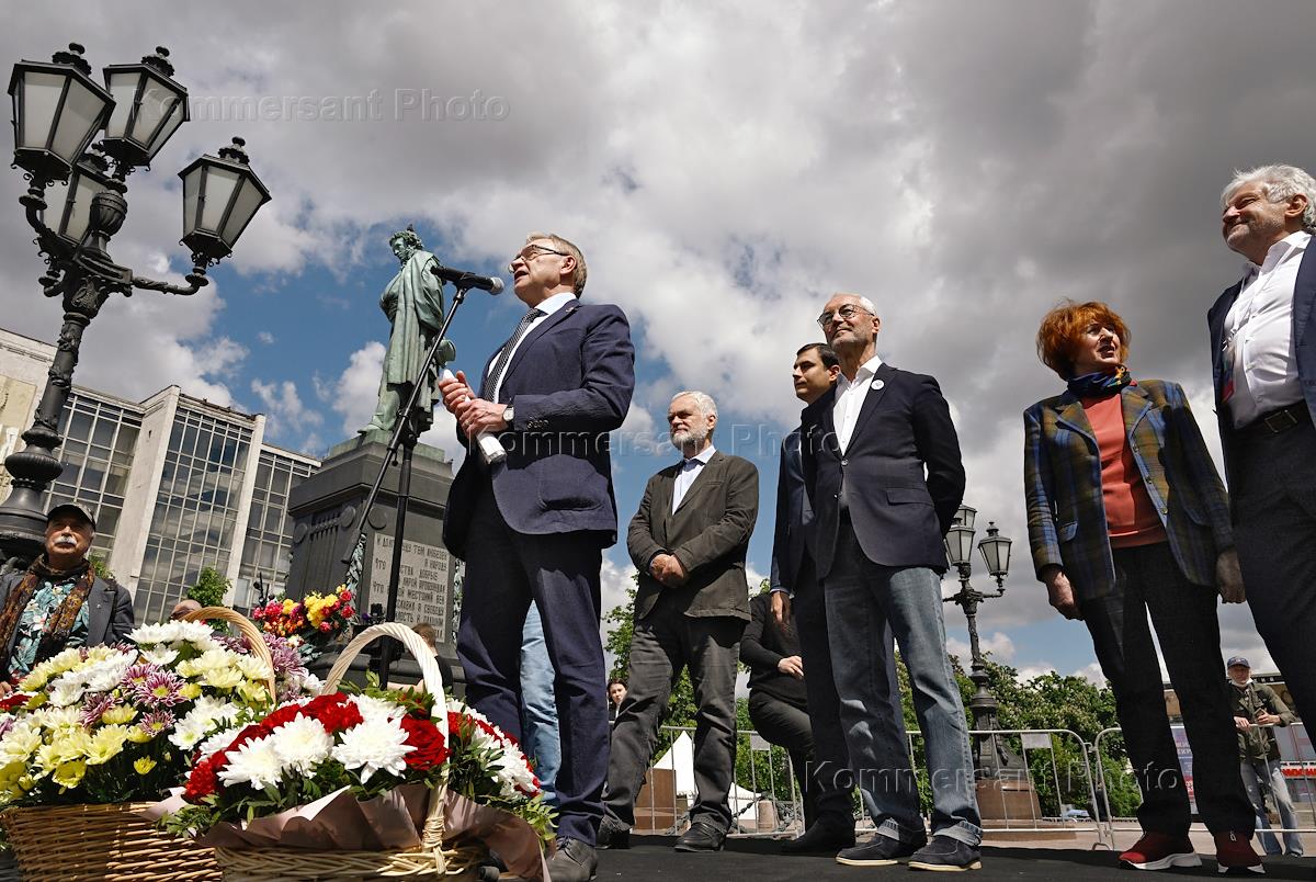 Торжественное возложение цветов к памятнику поэту Александру Пушкину на Пушкинской площади.