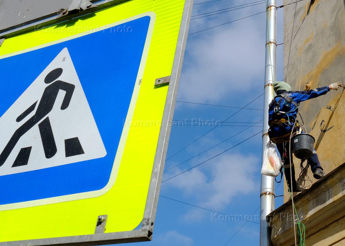 Виды Санкт-Петербурга. Жанровая фотография. Сотрудник коммунальных служб закрашивает портрет поэта…