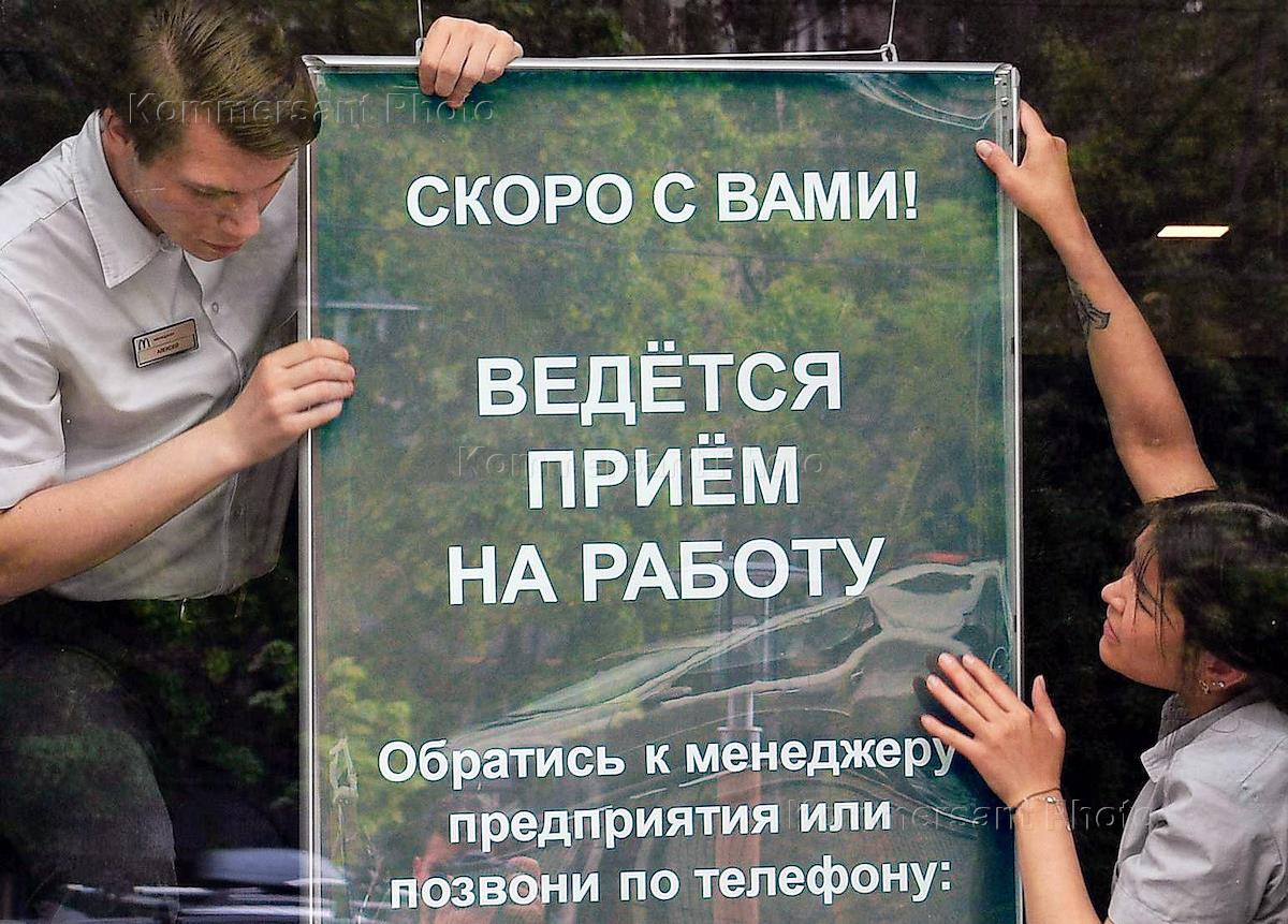 Жанровая фотография. Объявление о приеме на работу в витрине ресторана сети общественного питания…