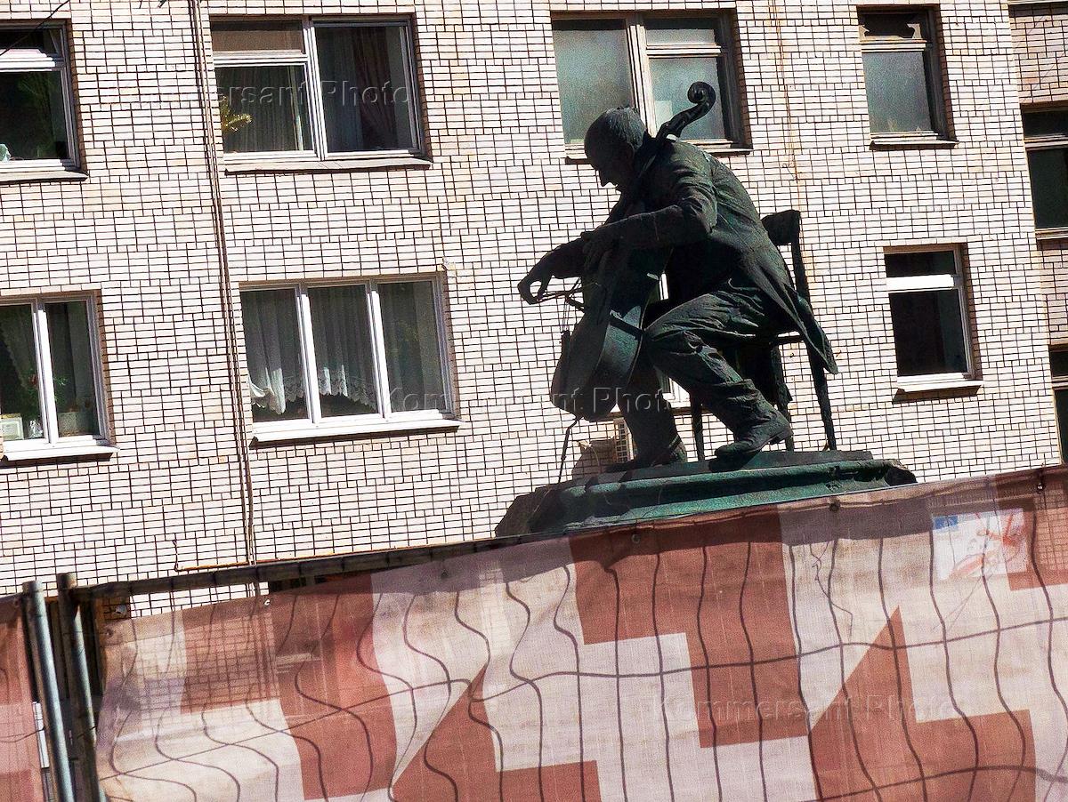 Виды летней Москвы. Памятник виолончелисту Мстиславу Ростроповичу в сквере его имени на перекрестке…