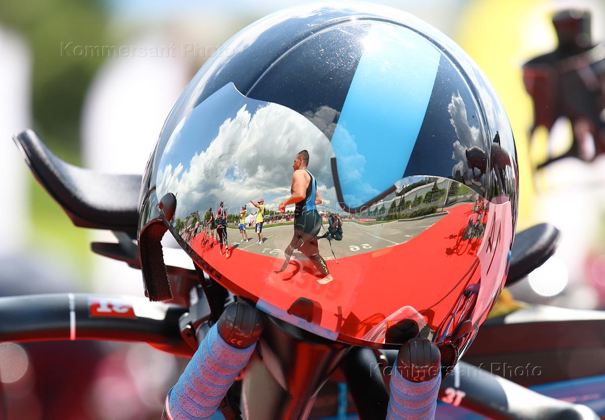 Соревнования по триатлону Iron Star. Жанровая фотография. Отражение в шлеме участников соревнования.