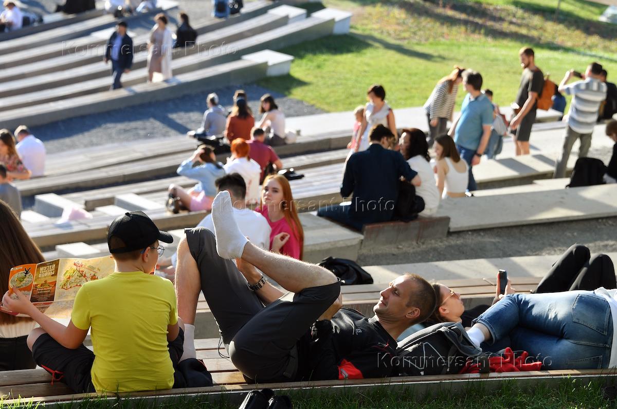 Московская неделя моды в парке "Зарядье". Жанровая фотография. Зрители на скамейках Большого…