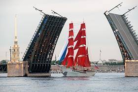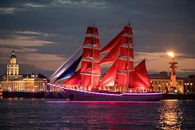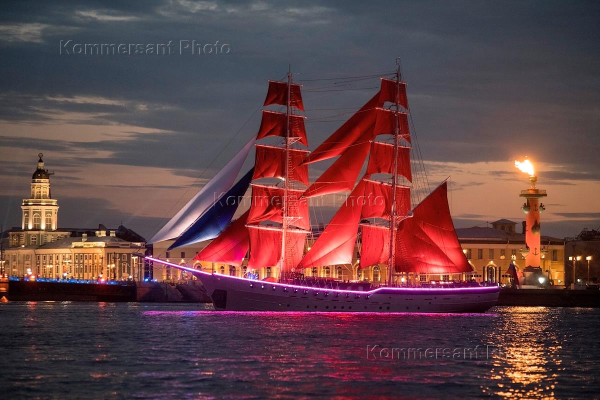 Репетиция выпускников средних школ Санкт-Петербурга "Алые паруса". Жанровая фотография. Бриг "Россия" в акватории Невы.