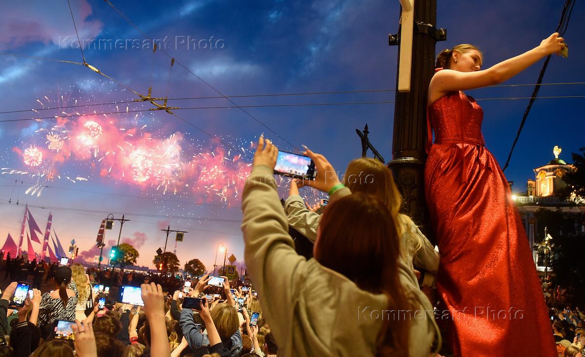 Праздник выпускников средних школ Санкт-Петербурга "Алые паруса". Выпускники снимают на мобильные…