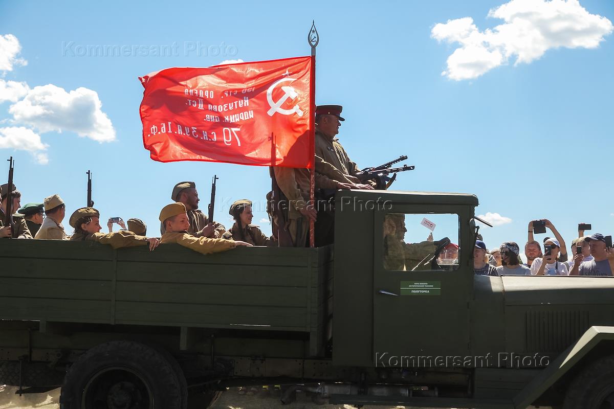 Военно-исторический фестиваль "Сибирский огонь". Участники в исторических костюмах во время боя на…