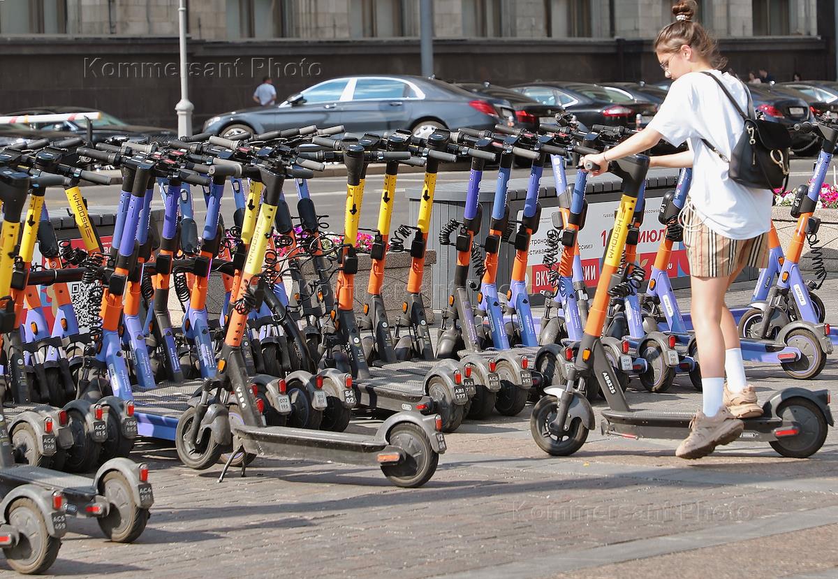 Жанровые фотографии. Жара в Москве. Стоянка проката самокатов на улице Охотный ряд.