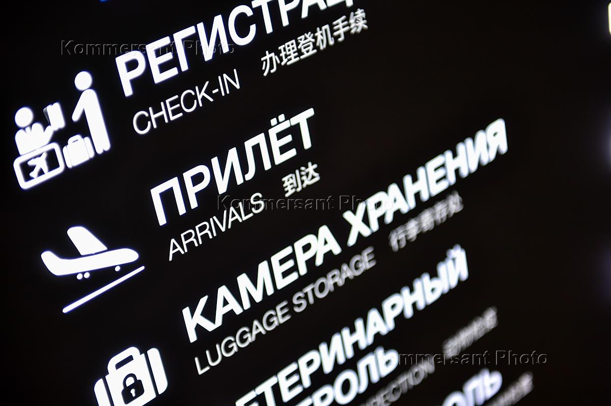 Работа международного аэропорта Толмачево (Новосибирск) имени А.И.Покрышкина. Указатель в зале…
