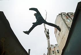 Двор "Дома Кирова" на Петроградской стороне. Человек прыгает с крыши на крышу.