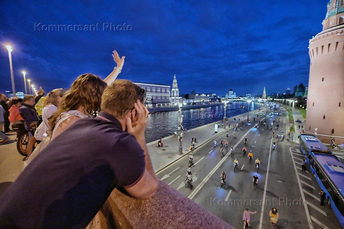Ночной московский велофестиваль. Жанровая фотография. Участники во время велосипедной прогулки по…