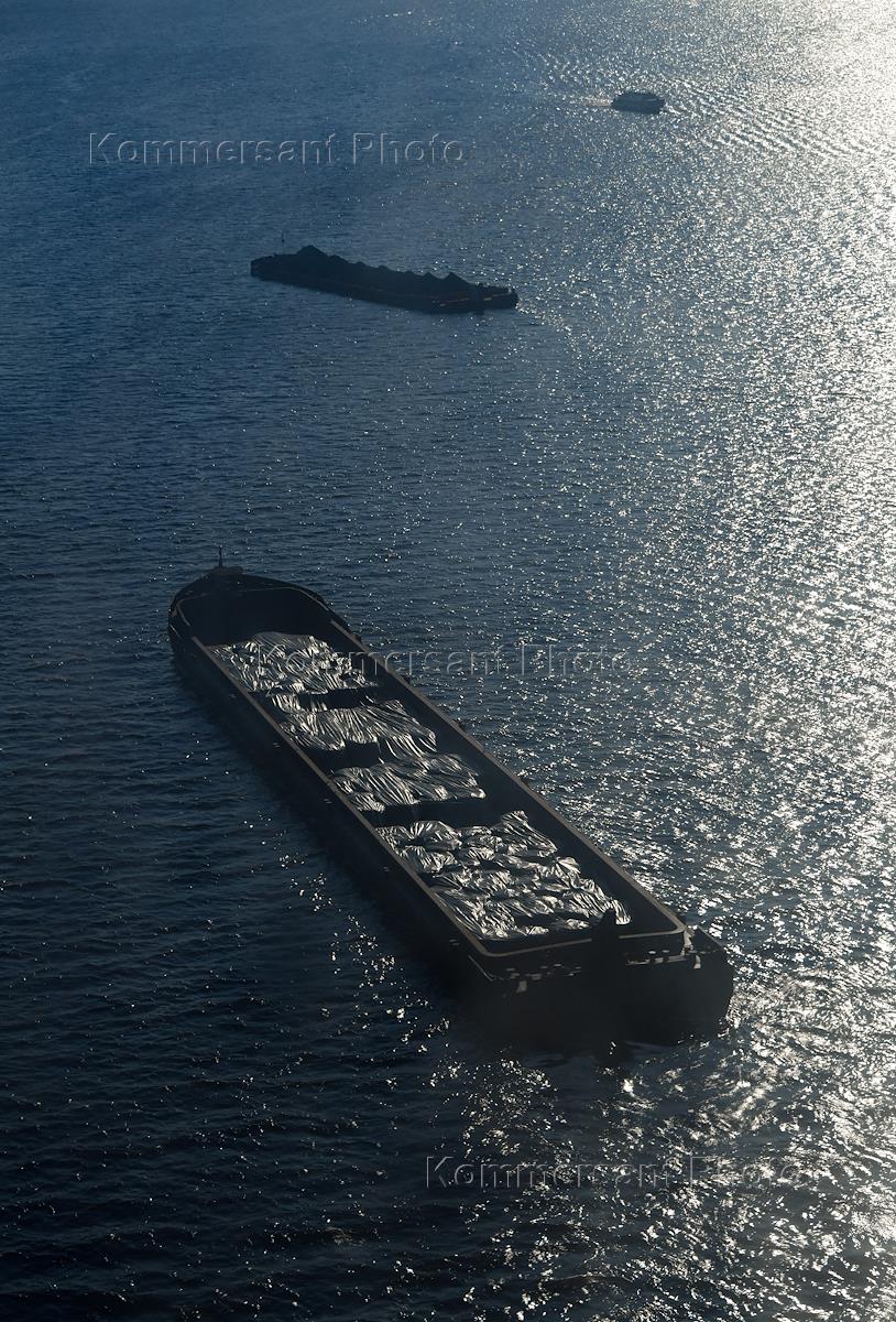 Жанровая фотография. Грузовые баржи на реке Волге. Вид с высоты канатной дороги.