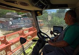Уборка зерновых культур в Крыму. Жанровая фотография. Водитель комбайна в кабине во время работы.