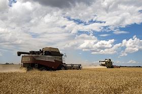 Уборка зерновых культур в Крыму. Жанровая фотография. Комбайны в поле во время сбора урожая.