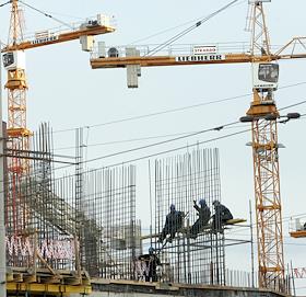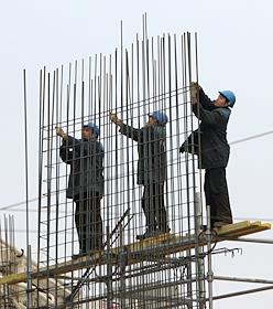 Строительство жилого дома. Рабочие сидят на железной арматуре.
