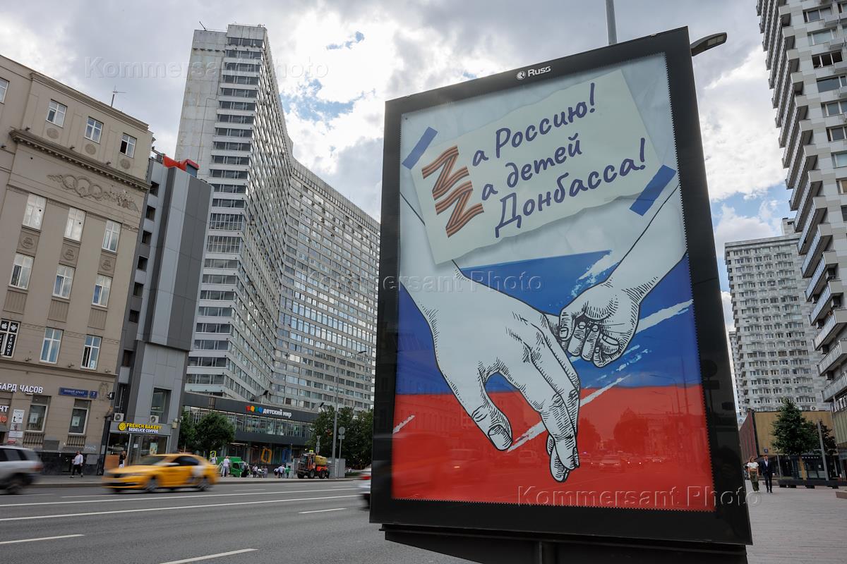 Плакаты в поддержку специальной операции Вооруженных Сил (ВС) России на Украине на улицах Москвы.…