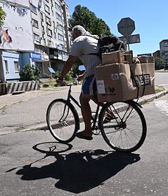 Ситуация в Бердянске. Жанровая фотография. Мужчина на велосипеде с картонными коробками на багажнике…