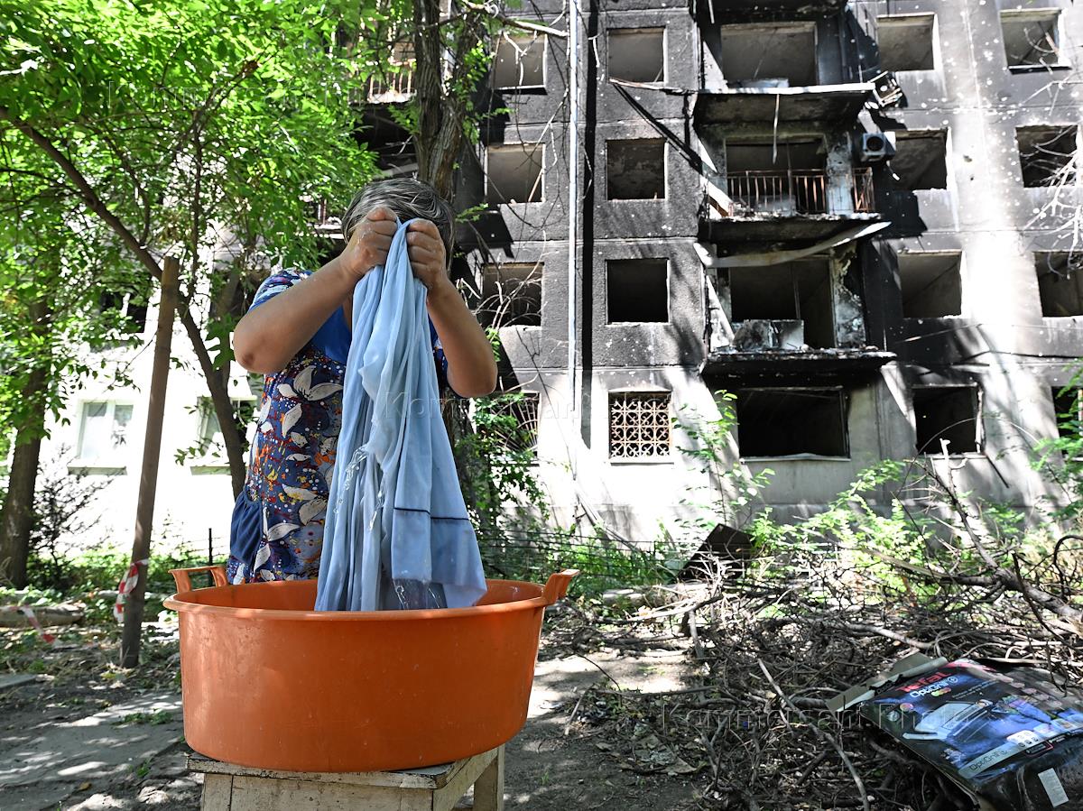 Ситуация в Мариуполе. Жанровая фотография. Женщина стирает белье во дворе разрушенного…