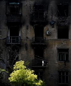 Ситуация в Мариуполе. Жанровая фотография. Разрушенный после пожара жилой дом на улице города.