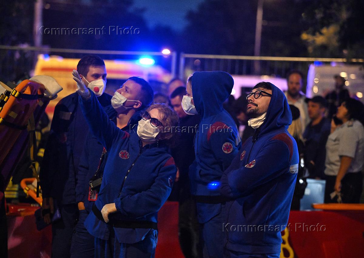 Сотрудники скорой медицинской помощи на месте тушения пожара на крыше жилого дома на Ленинском…