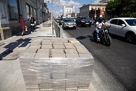 Виды Екатеринбурга. Жанровая фотография. Упаковки с тротуарной плиткой на одной из улиц города.