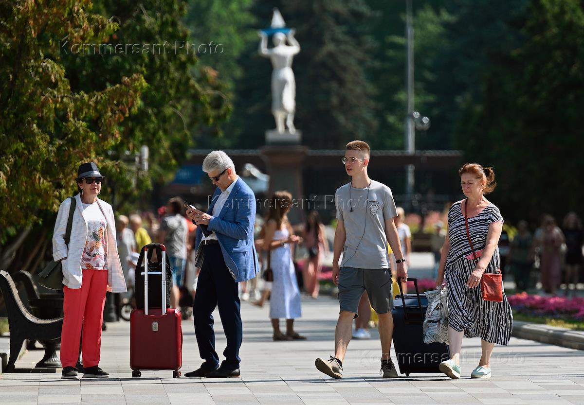 Виды Москвы. Жанровая фотография. Туристы с чемоданами в парке Северного речного вокзала.