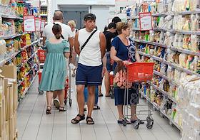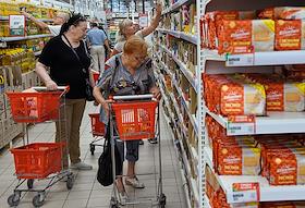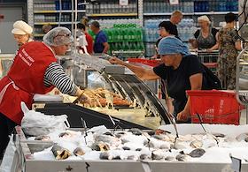 Работа магазина гипермаркета "Ашан". Жанровая фотография. Покупатели в торговом зале магазина.
