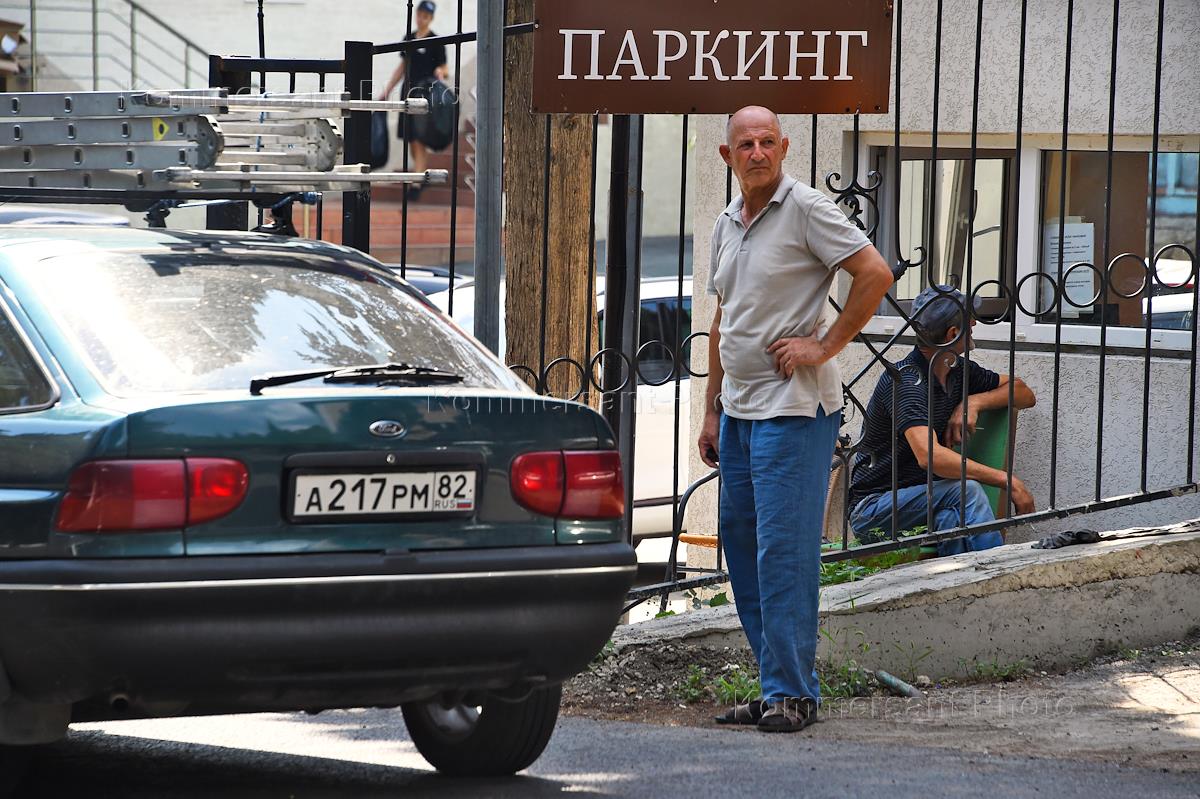 Виды Ялты. Жанровая фотография. Автомобиль у въезда на территории паркинга.