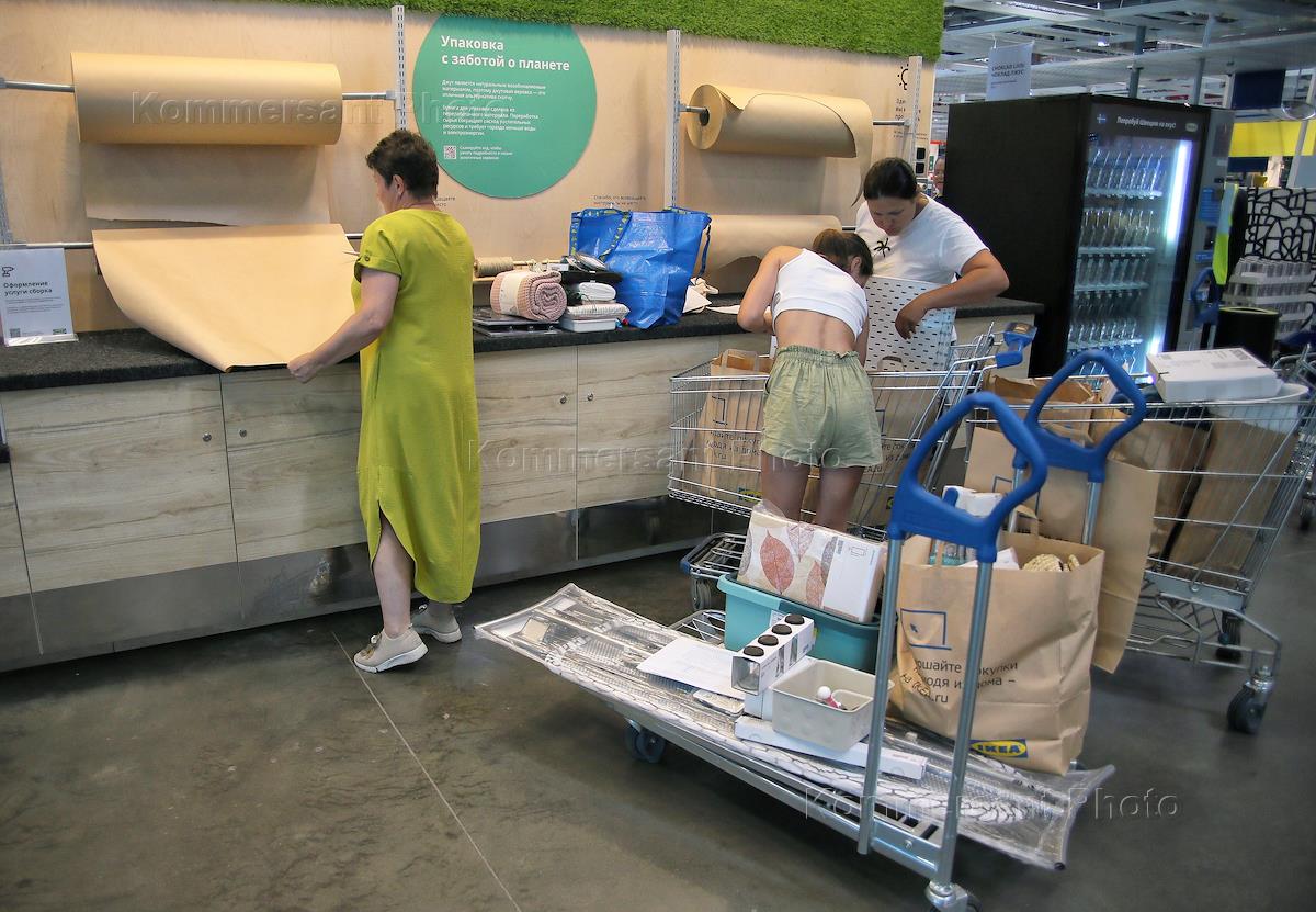Работа пункта выдачи магазина "ИКЕА". Покупатели во время упаковки товаров на выходе из пункта.