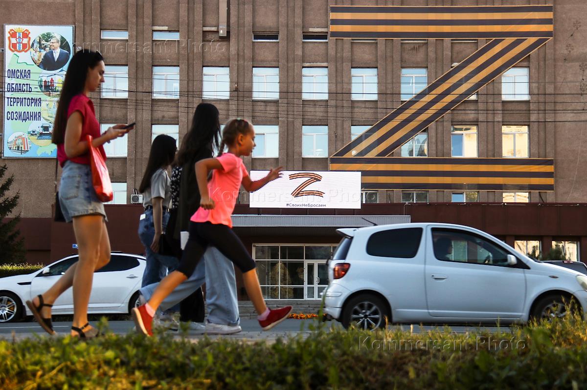 Жанровая фотография. Символ Z и экран с текстом "Своих не бросаем" на фасаде административного…