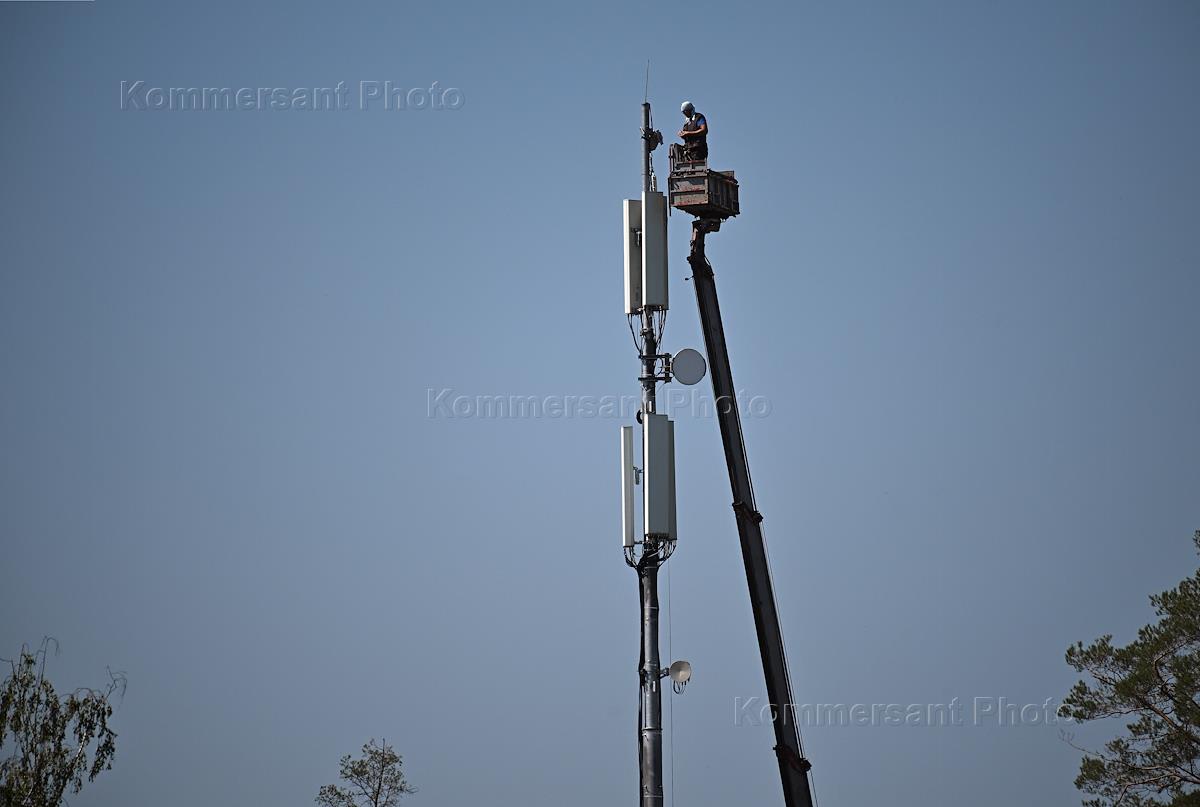 Жанровая фотография. Рабочий на подъемнике во время работы на многофункциональной опоре сотовой…