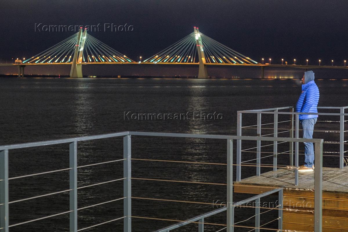 Виды ночного Санкт-Петербурга. Автодорожный металлический вантовый мост через Корабельный фарватер,…