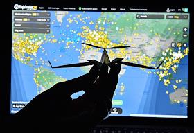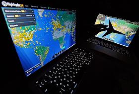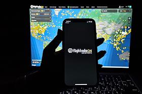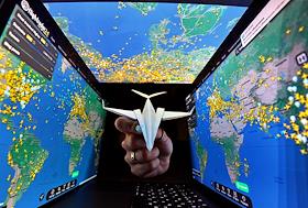 Жанровая фотография. Бумажный самолетик среди компьютерных экранов со страницей сайта Flightradar24.…