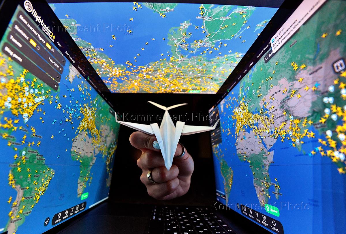 Жанровая фотография. Бумажный самолетик в женской руке на фоне страницы сайта Flightradar24.…
