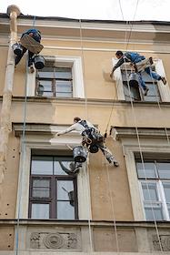 Жанровая фотография. Промышленные альпинисты во время покраски фасада здания.