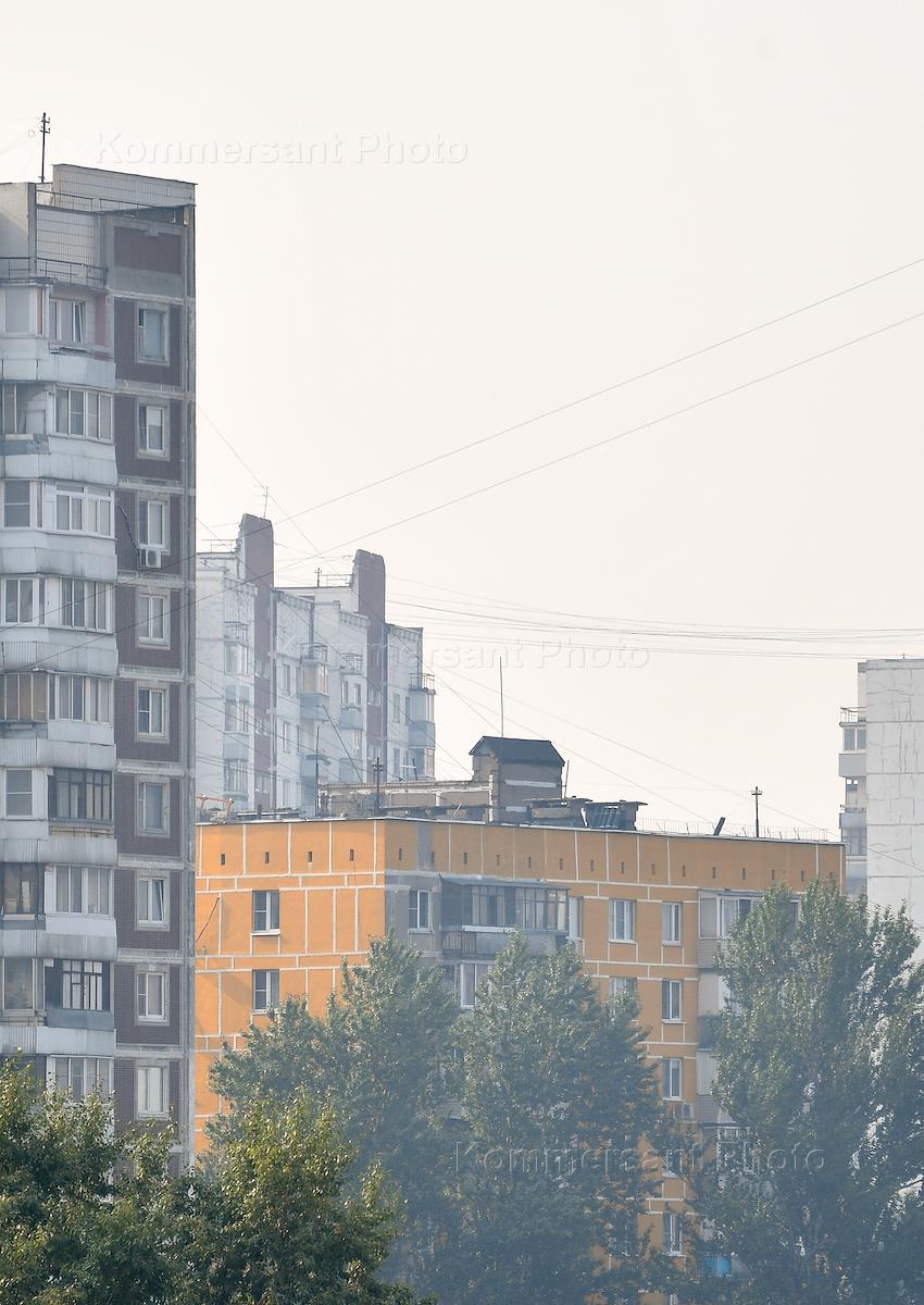 Виды Москвы. Район Западное Дегунино. Дым и смог от лесных пожаров в Рязанской области.