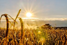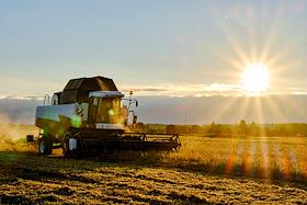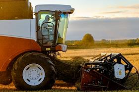 Жанровая фотография. Зерноуборочный комбайн ACROS 585 собирает урожай зерновых культур в поле…