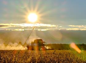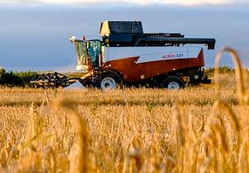 Зерноуборочный комбайн ACROS 585 собирает урожай зерновых культур в поле Ленинградской области.
