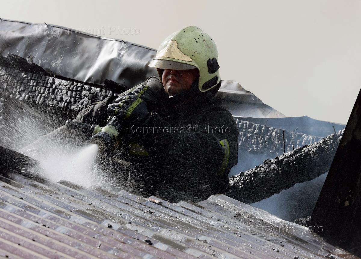 Пожар в частном доме на Рязанской улице в городе Егорьевск. Жанровая фотография. Сотрудник пожарной…