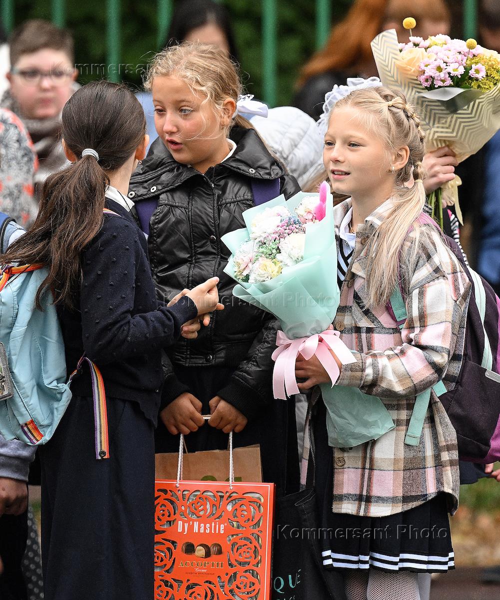 Празднование Дня знаний (1 сентября). Торжественная линейка в ГБОУ школа № 46. Ученики с цветами на…