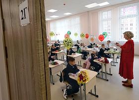 День знаний (1 сентября) в Опалиховской гимназии. Жанровая фотография. Первоклассники в классе перед…