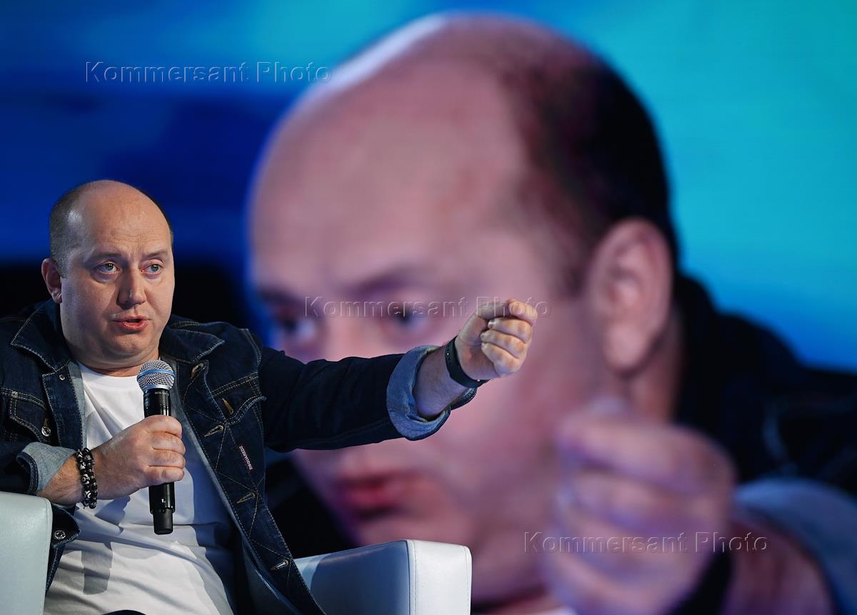 Форум "Знание. Сила" в концертом зале "Зарядье". Актер Сергей Бурунов (справа) во время выступления…