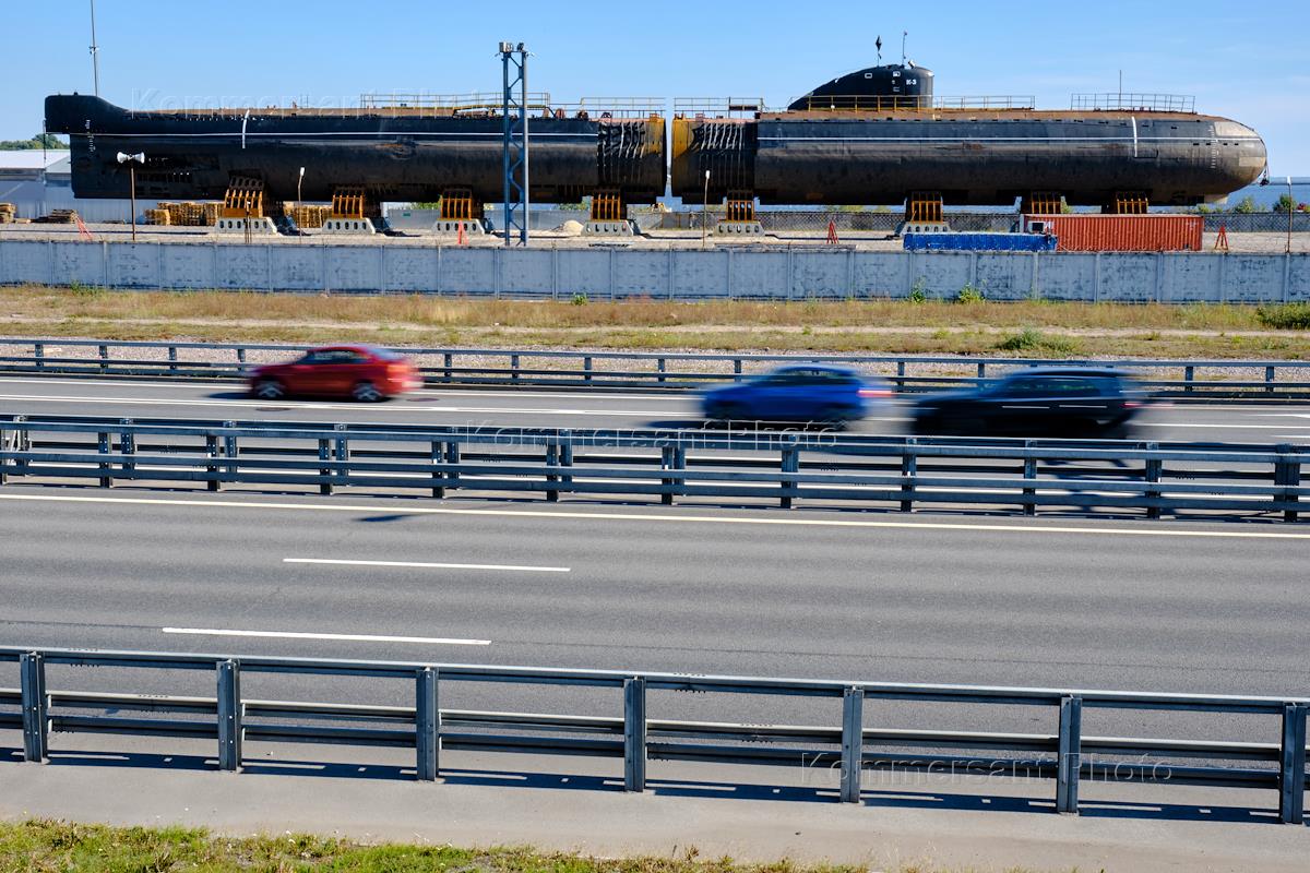Вид подводной лодки К-3 "Ленинский комсомол" на территории контейнерного терминала «Моби Дик» в Кронштате.