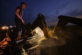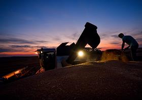 Сбор урожая пшеницы в Оренбургской области. Загрузка зерна в кузов грузового автомобиля.